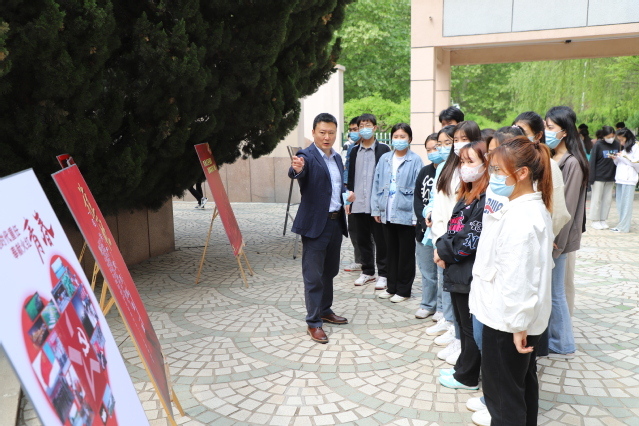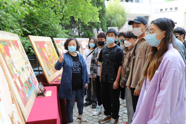 4月26日,美术学院师生作品展在一号教学楼举办。观展过程中,院长王勇、副院长陈隶静现场为所联系班级学生和参观展览的学生上了一堂思政课。