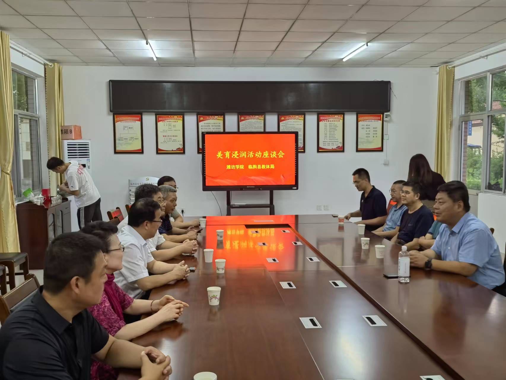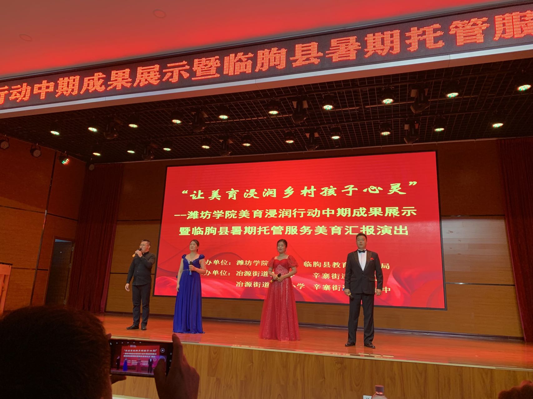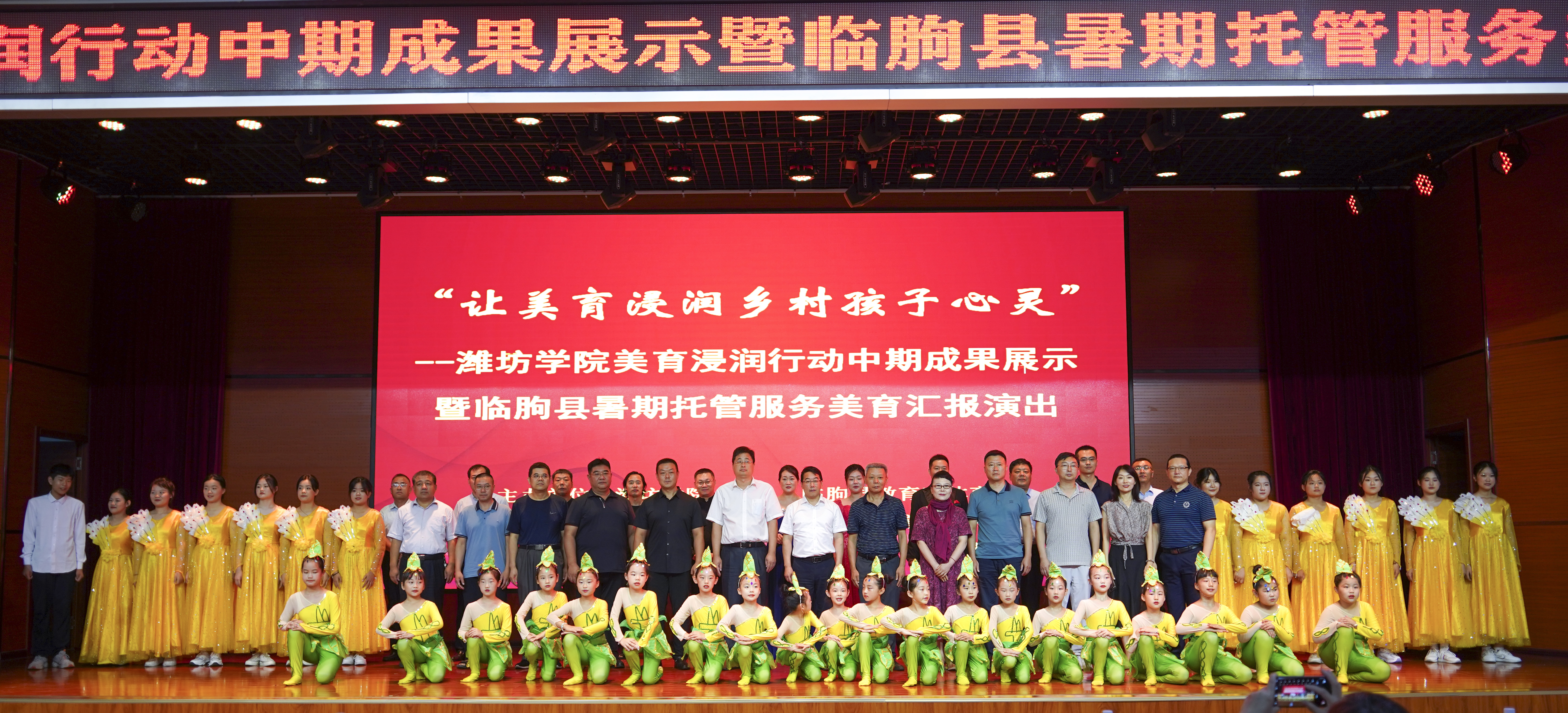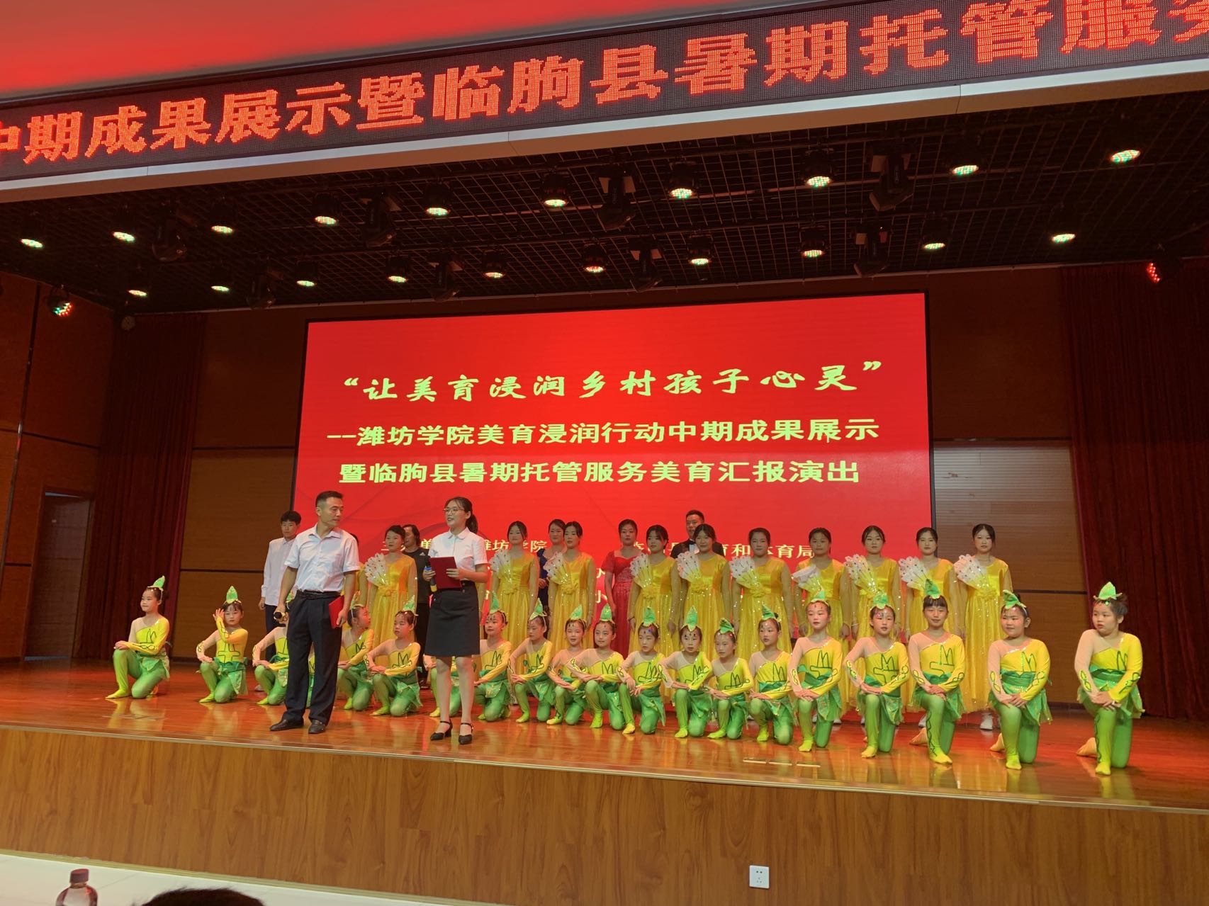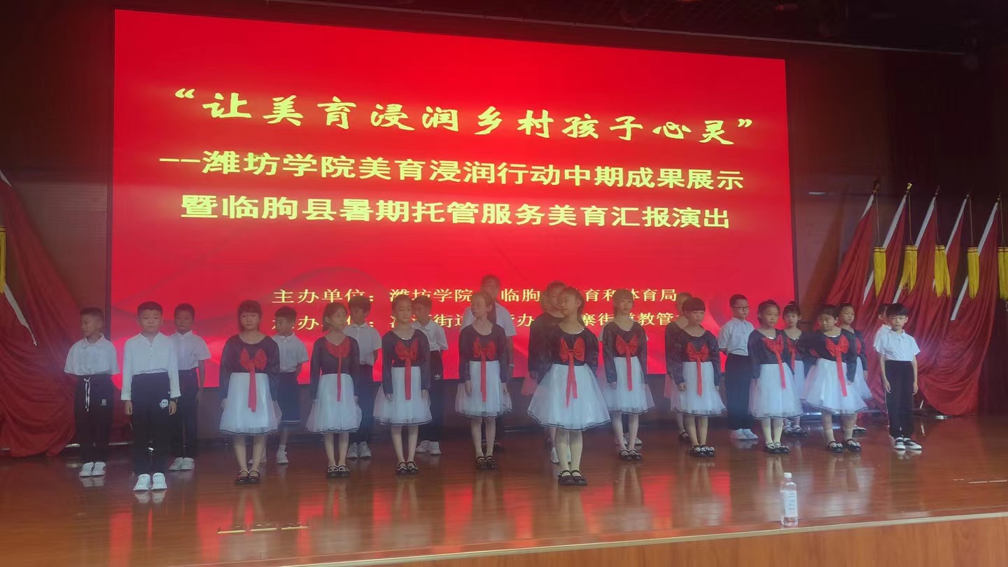 2022年8月19日上午,“美育浸润童心,艺术点亮未来——潍坊学院、临朐县冶源小学、辛寨初级中学美育浸润行动阶段成果汇报”在临朐县中小学生综合实践学校成功举办。参加活动的有潍坊学院宣传部部长单振涛、教务处处长侯金奎、音乐学院党总支书记高宏伟、院长王雷、美术学院党总支书记刘雪梅、院长王勇、潍坊市教科院中学艺术教研员冯雷、临朐县教体局副局长安勇军,潍坊学院美术音乐授课教师及临朐县各乡镇教管学校领导等观看演出汇报,会后学院领导及参加美育浸润授课教师与临朐县教体局有关领导召开美育浸润活动座谈会。山东省教育厅美育浸润行动计划开展以来,潍坊学院与冶源小学、辛寨初级中学作为试点单位,坚持以习近平新时代中国特色社会主义思想为指导, 以立德树人为根本,以社会主义核心价值观为引领,以培养学生审美人文素养为核心,充分发挥高校人才资源优势,为中小学美育均衡发展提供优质教育资源,以美育人,为乡村孩子们点亮心灵之光。