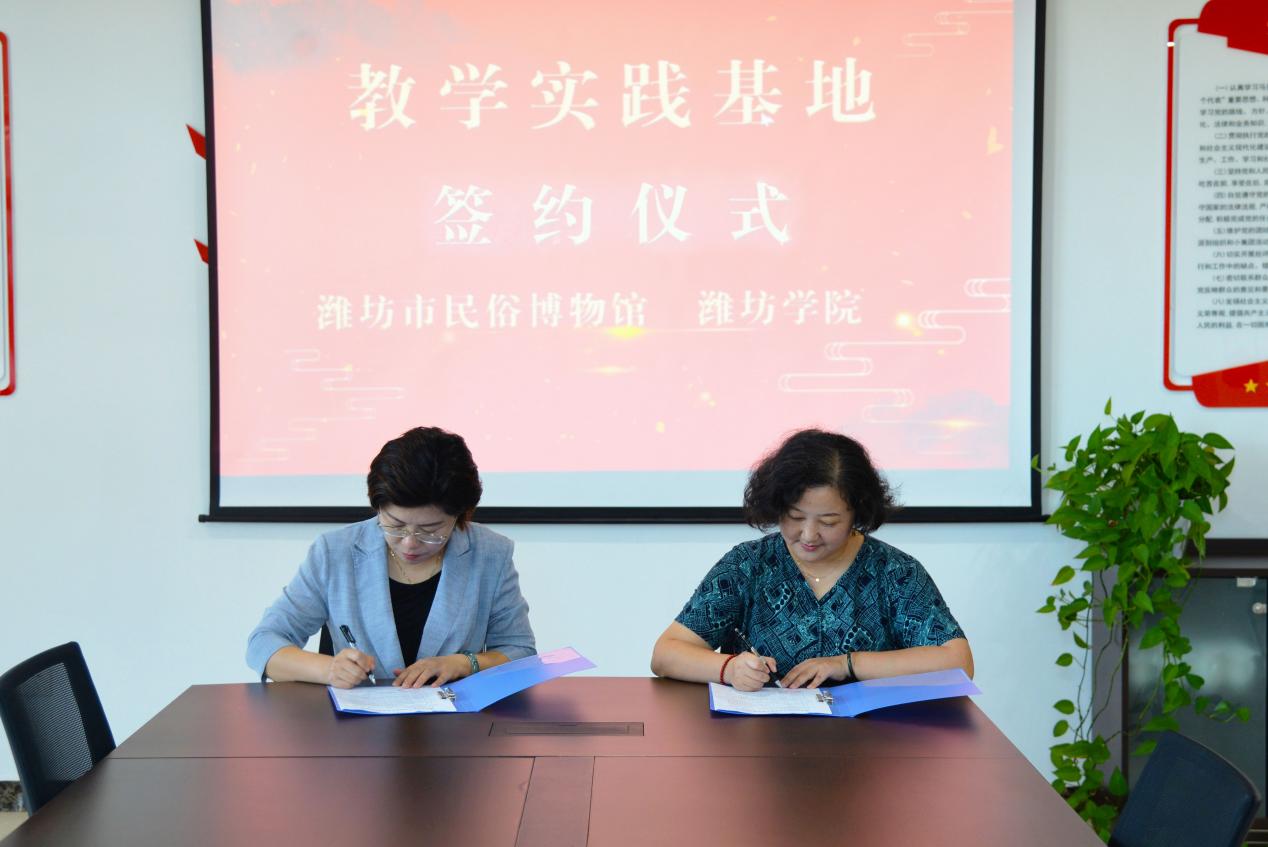 为建设高质量应用型大学特色专业,加强与地方企事业单位的教学实践联系,为学生提供更多优质实践学习平台,9月2日,潍坊学院美术学院与潍坊市民俗博物馆签订了教学实践基地协议并举行了挂牌仪式。