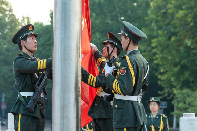 清晨6时40分升旗仪式正式开始,国旗班的旗手们迈着铿锵有力的步伐,步入升旗台。随着“升国旗、奏国歌”的口令,五星红旗冉冉升起,与火红的旭日交相辉映,雄壮的国歌回荡耳畔。全体师生庄严肃立,向国旗行注目礼。