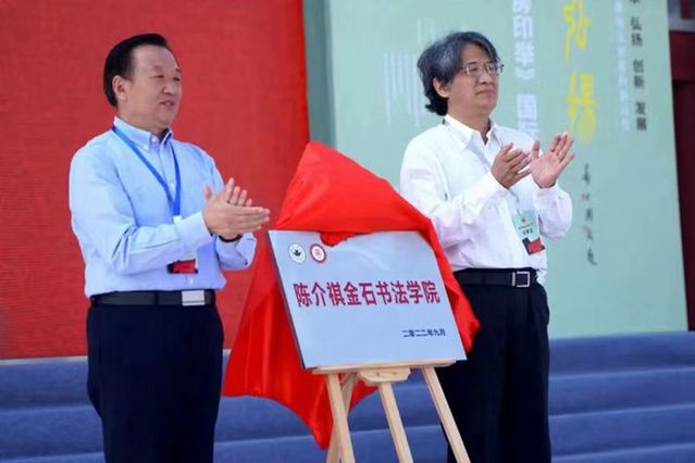 9月25日,“第四届陈介祺艺术节”开幕式在潍坊市潍城区十笏园文化街区中心广场举行。开幕式上,举行了“陈介祺金石书法学院”揭牌仪式。中国书法家协会分党组副书记、秘书长郑晓华与潍坊学院党委书记李东共同为“陈介祺金石书法学院”揭牌。