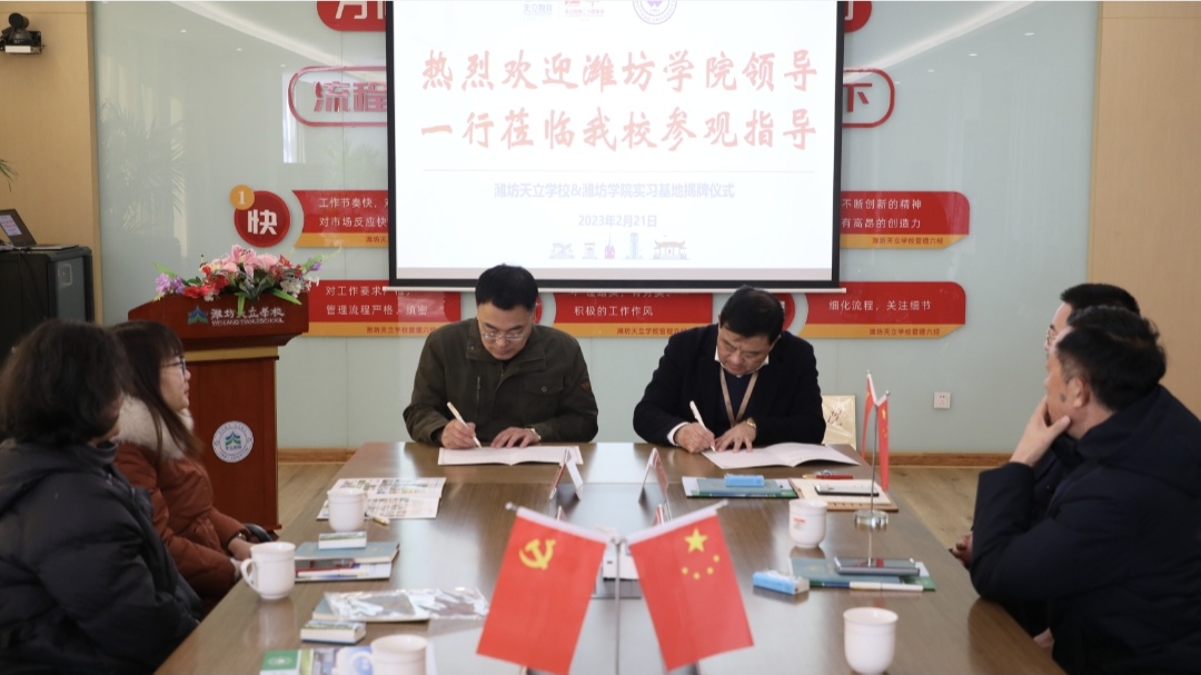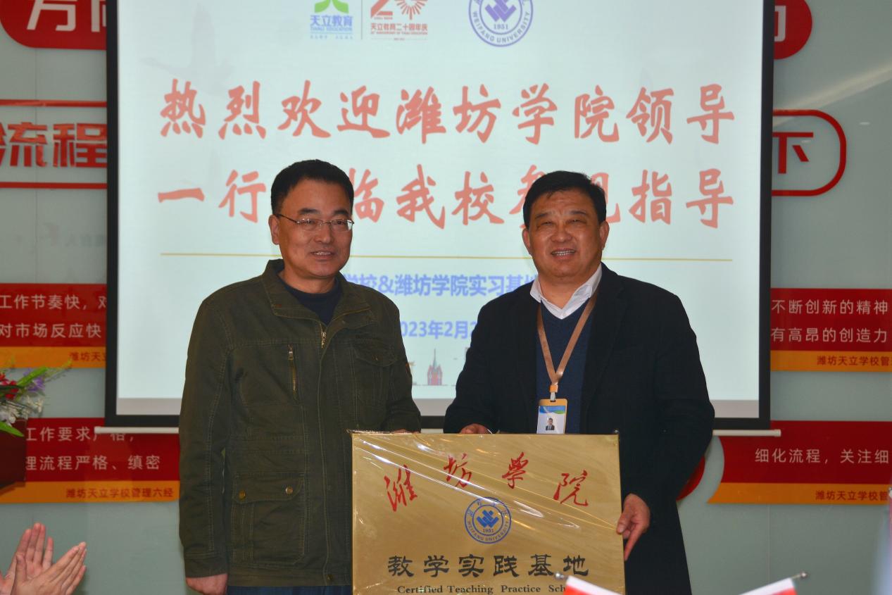 安顿好师范生后,双方举办了签约和挂牌仪式,天立学校王品章校长对毕处长一行的到来表示了欢迎,对27位师范生提出了期望要求,希望以本次教育实习为契机,与潍坊学院建立长期教学实践联系。毕处长代表潍坊学院介绍了学校的基本情况以及学校未来发展思路,毕处长也希望师范生们可以把握好本次教育实习的机会,努力提升自身教育教学水平。随后双方签订了教学实践基地协议书,并举行了挂牌仪式。
