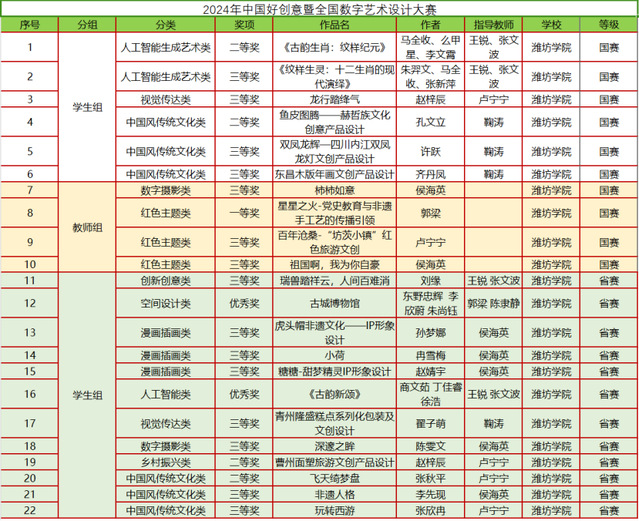 环境设计专业、视觉传达设计专业与机械与自动化学院的工业设计专业联合申报“设计”专业学位硕士点,顺利获批学校“学科振兴三年行动计划(2024-2026)立项建设项目”培育建设项目,《视觉传达设计专业实践教学共同体建设研究》获批山东省教育厅山东省普通本科高校重点领域教学改革试点项目。1人荣获山东省教学名师。“艺术与审美”微专业获批招生。学院获教研项目8项,组织学生参加省级以上比赛获奖76项,国家级奖励12项;教师参加省级以上比赛获奖20项,国家级奖励8项。学校在线课程立项1项,智慧课程立项5项;在线课程结项3项;新增山东省一流课程1门;学校课程思政示范课程和优秀教学案例3项;学校第一批课堂教学改革优秀案例2项;校级教师教学创新大赛获奖二等奖4项,三等奖2项,出版高水平教材2部。