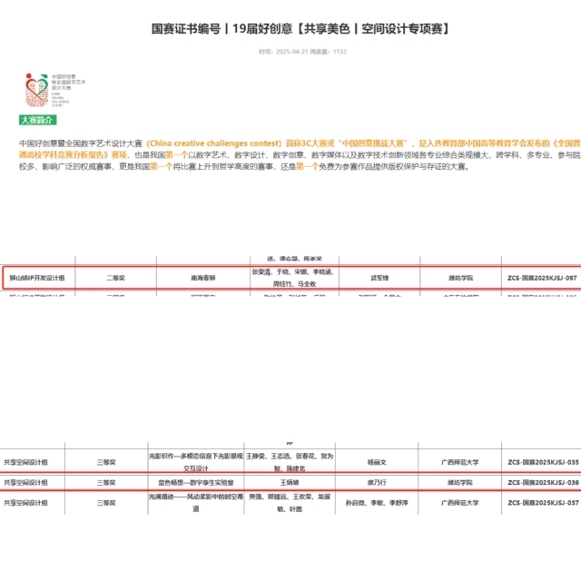 中国好创意暨全国数字艺术设计大赛是教育部中国高等教育学会发布的《全国普通高校大学生学科竞赛分析报告》中的第50项赛事,也是全国第一个以数字艺术为核心的大赛。在此次第19届好创意共享美色——空间设计专项赛中,武军锋老师团队凭借在IP开发设计中的独特创意与精湛技艺,荣获国赛二等奖,张景瑜老师团队在共享空间设计领域大胆创新,荣获国赛三等奖。