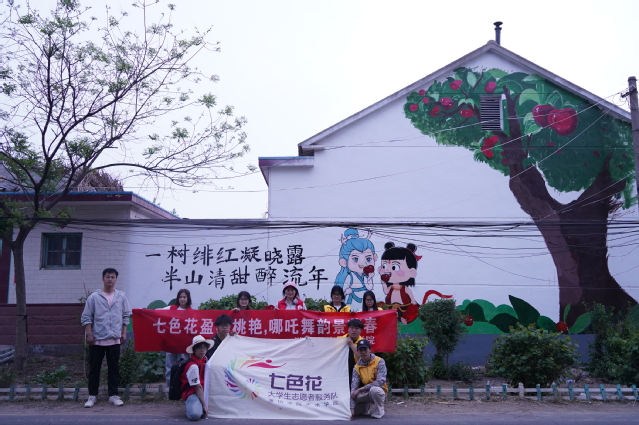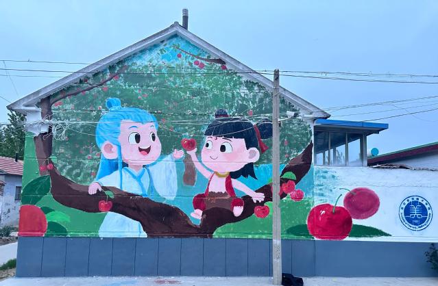 活动现场,志愿者们围绕樱桃元素精心构思,将饱满圆润的果实、翠绿的枝叶与田园风光及大热哪吒IP巧妙融合,创作出兼具艺术性与地域特色的墙绘作品。从起形、上色到细节雕琢,同学们分工明确、默契配合,鲜艳的色彩在墙面徐徐晕染,原本朴素的墙壁逐渐变成一幅幅生动的艺术画卷,夜幕降临,八面墙绘全部完工。哪吒的飒爽英姿与娇艳欲滴的樱桃相互映衬,将景芝镇的文化特色与产业优势展现得淋漓尽致。