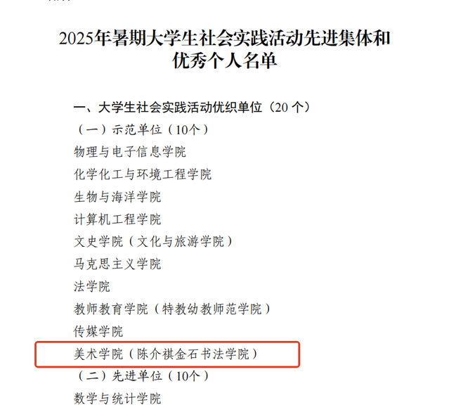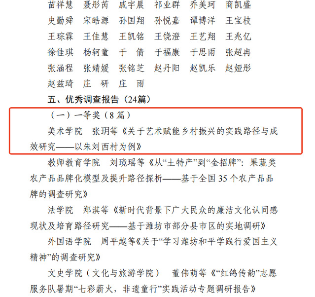 在2025年暑期“返家乡”社会实践活动中,学院学子积极响应号召,扎根乡土“大课堂”,在实践中锤炼本领,共有8名学生荣获“优秀个人”称号,分别是张雅淇、刘娱萌、林钰涵、许文硕、石乙茹、崔馨元、庄光淇、韩润溪。他们走出校园“象牙塔”,深入基层一线,围绕帮扶支教、社区服务等领域开展实践服务,以实际行动赢得了服务地的认可与赞誉。在2025年暑期“三下乡”社会实践活动中,学院更是多点开花,收获集体与个人荣誉大满贯。学院凭借完善的组织保障、特色鲜明的实践项目及广泛的社会影响力,获评“大学生社会实践活动优组单位”。由学院学子组成的“七色花”大学生志愿者服务队与尽美社志愿队,因活动开展扎实、服务成效显著,获评“大学生社会实践活动优秀服务队”。个人荣誉方面,75名学生凭借在实践中的突出表现荣获“优秀学生”称号。更值得庆贺的是,在优秀调查报告评选中,学院张玥等同学撰写的《关于艺术赋能乡村振兴的实践路径与成效研究——以朱刘西村为例》凭借深刻的调研视角、扎实的研究内容,荣获一等奖。