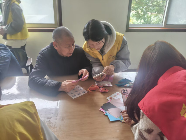 活动现场,志愿者们带着彩纸、剪刀等材料,围坐在老人身边,耐心示范折纸步骤:从简单的火箭、爱心、纸船,到可爱的小蜜蜂、小青蛙,小粉猪等,志愿者们手把手指导老人折叠,遇到动作迟缓的老人,便放慢节奏、反复讲解。老人们认真跟着操作,时而互相展示成果,时而笑着询问技巧,原本安静的敬老院里满是欢声笑语。
