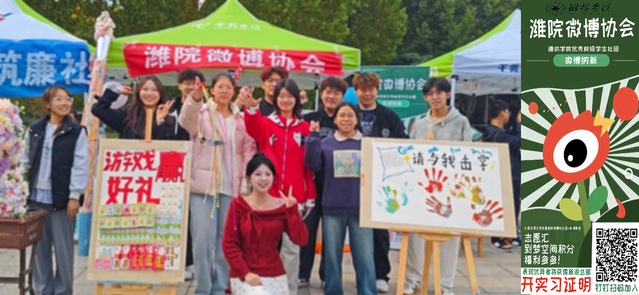社团嘉年华热潮席卷潍院之际,10月31日至11月1日,潍院微博协会以满腔热忱交出了首秀答卷!作为校园文化的新鲜力量,协会带着年轻的活力与创意,在这场青春盛宴中绽放独特光彩。