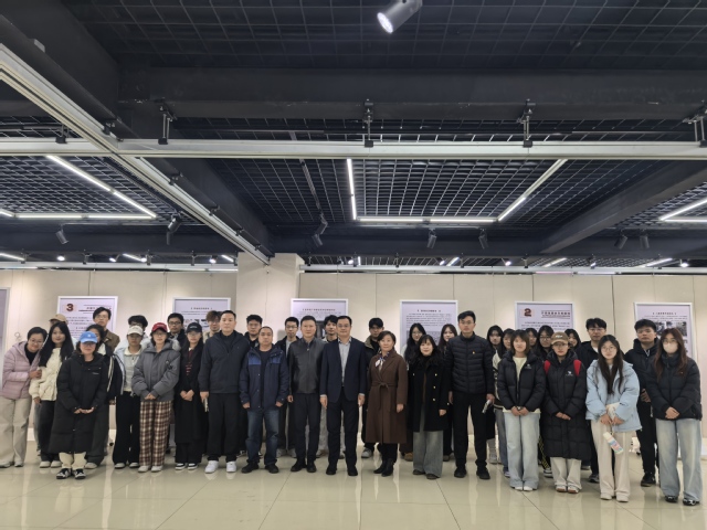 最后,赵加强来到联系班级参加主题教育活动,与2022 级书法班的同学们共同参观“潍原烽火红”纪念抗战胜利80周年图片展。师生在沉浸式回顾抗战岁月、感悟革命先辈家国情怀的过程中,接受了深刻的爱国主义教育与精神洗礼。他鼓励同学们从红色历史中汲取奋进力量,将爱国情、强国志融入书法创作与成长实践,以笔墨传薪火、以青春赴使命。