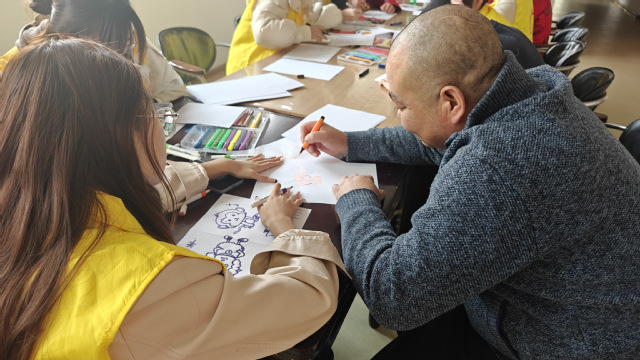 活动当天,志愿者们提前备齐画纸、彩笔等工具,和敬老院的老人们围坐成温馨的小圈,一场“画笔话温情”的绘画时光就此开启。考虑到老人的创作节奏,志愿者们特意挑选了太阳、花朵、小屋这类简单又温馨的主题,全程手把手陪着老人;从帮爷爷奶奶握住画笔勾勒基础线条,到蹲在旁边教他们挑柔和的色彩填涂。