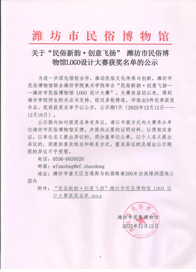 近日,潍坊学院美术学院与潍坊市民俗博物馆联合主办的“民俗新韵・创意飞扬 —— 潍坊市民俗博物馆 LOGO 设计大赛” 圆满收官。在学院精心组织与专业指导下,师生团队深耕民俗文化、创新设计表达,经学院初选,潍坊市民俗博物馆最终筛选,教师组谭雯老师,学生组王一陈、孙亚泽、孙若菡、李诗婉共5 件作品从众多方案中脱颖而出斩获最佳奖项,彰显了学院在人才培养、民俗文化传承及校地合作中的扎实成效。