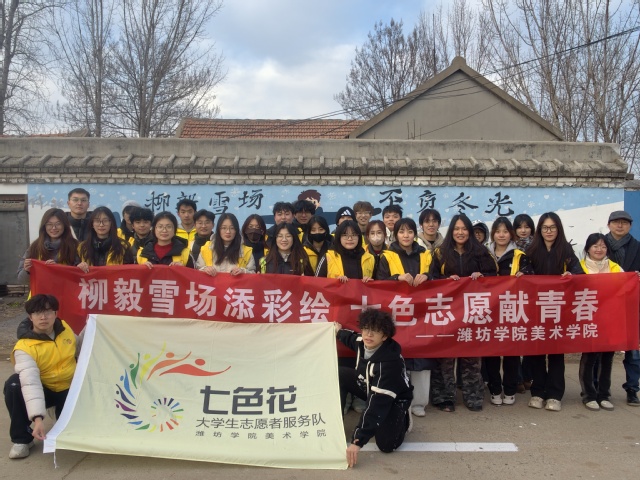 近日,我院“七色花”大学生志愿者服务队携手“尽美社”走进潍坊市寒亭区朱里街道刘毅山滑雪场,开展了“柳毅雪场添彩绘·七色职员献青春”主题墙绘活动。寒风凛冽,却未能阻挡艺术学子服务乡村的热情,队员们在辅导员老师的带领下团结协作,历时一天精心创作,最终完成了总面积逾200平方米的生动墙绘,以专业画笔为冬日雪场增添了一道亮丽而温暖的文化风景线。