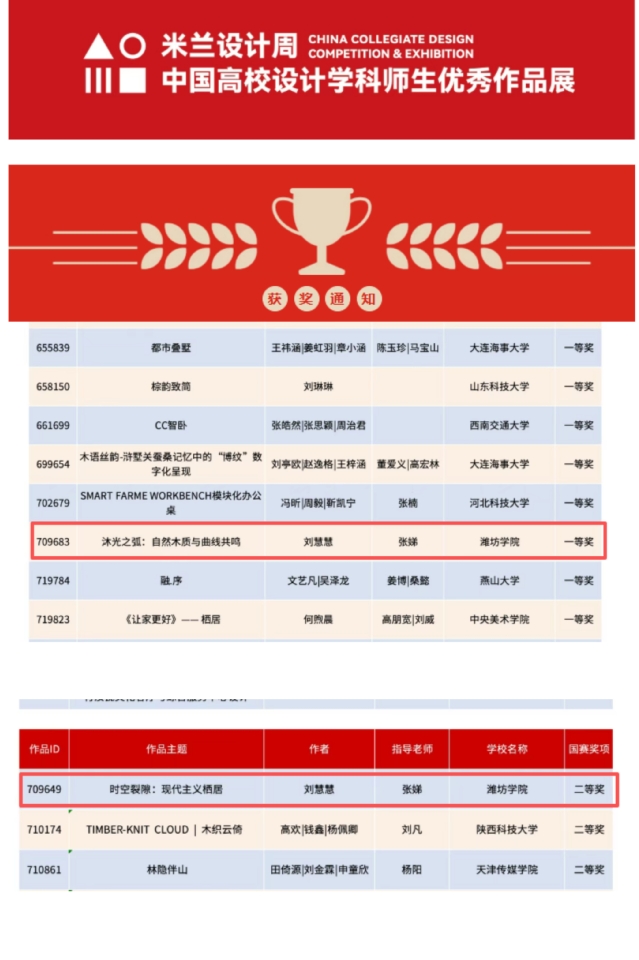 3月2日,第十一届“兔宝宝杯” 家居国际设计大赛获奖名单正式公示,我院张娣老师指导的两件设计作品脱颖而出,荣获国家级一等奖 1 项、国家级二等奖 1 项,彰显学院设计教育与创新实践的过硬实力。
