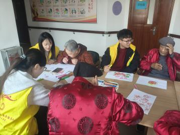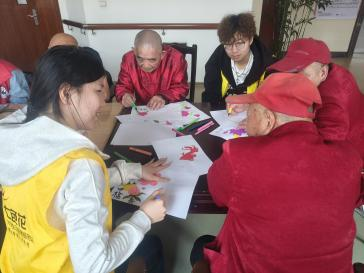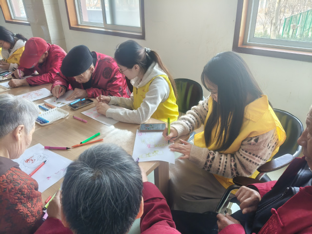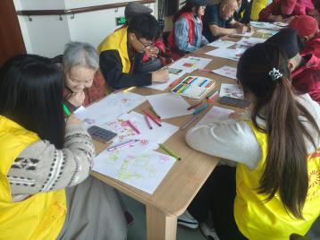 活动现场,志愿者们与老人们围坐在一起,一边拉着家常,一边为老人们展示提前准备好的绘画作品。志愿者们全程耐心陪伴:从握住老人的手勾勒基础线条,到蹲在身边指导挑选柔和色彩填涂,每一个细节都满含用心。在画笔的起落间,老人们的脸上渐渐绽开笑容,有的分享起年轻时的趣事,有的和志愿者唠起家常,原本安静的房间里充满了欢声笑语。活动结束时,老人们捧着自己的画作,和志愿者们一起合影留念。